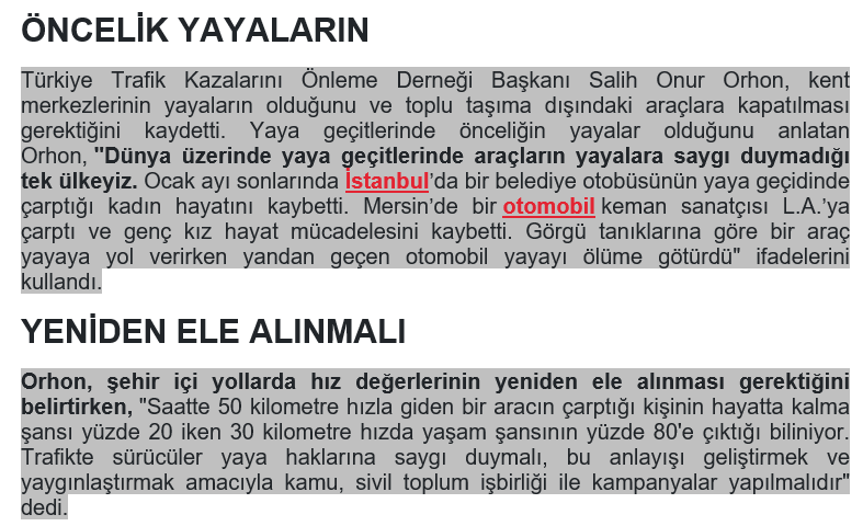 Türkiye Trafik Kazalarını Önleme Derneği, Yaya Hakları Bildirgesi yayınladı. Bildirgenin amacı ise kaldırımların yayalara ait olduğunu hatırlatmak. Son zamanlarda neredeyse her gün birkaç vatandaş, hayatını araç çarpmasından dolayı kaybediyor. Vatandaş dikkatsiz, araçlar da aşırı hızlı olunca kazalar kaçınılmaz olabiliyor. Yaşanan son olaylarda, Sakarya’da yaya geçidinden geçmeye çalışan bir kadına 5 dakika arayla 2 araç çarparken, Antalya’da yolcu indirmek için duran iki minibüsün arasından koşarak yola fırlayan yaya da araç çarpması sonucunda yaralandı.